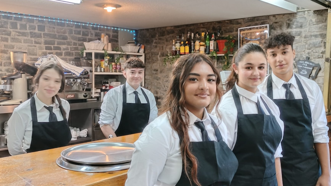 Neljä espanjalaista henkilöä koulun ruokalassa, kolme heistä kokkivaatteissa.