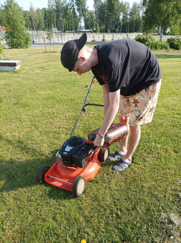 Kuvateksti: Jyväskylässä asuva Mikael kaataa bensiiniä ruohonleikkuriin. Hänen mielestään juuri ruohonleikkuu on ollut mielekkäin työtehtävä kesätyössään.