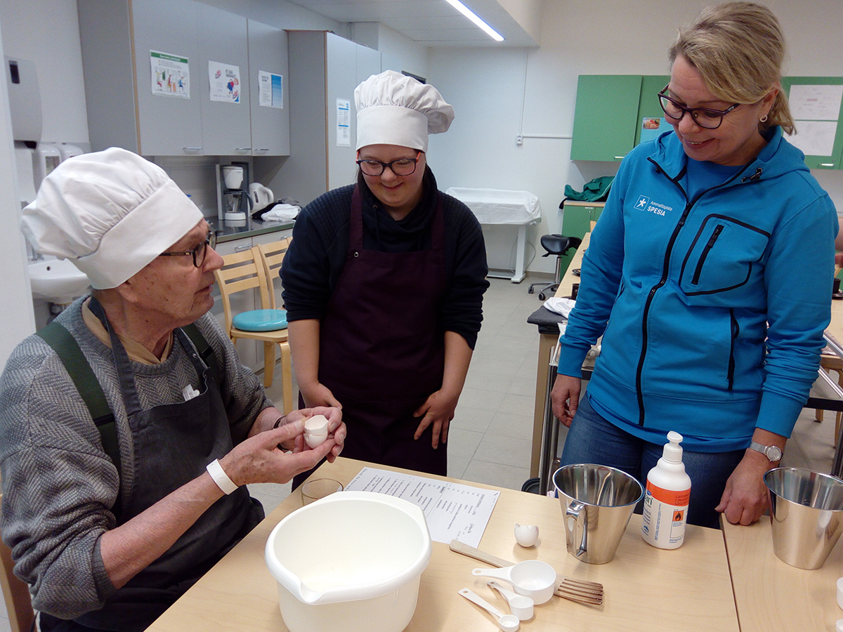 ”Toimintaan osallistuvilla on tavoitteena kuntoutua omaan kotiin tai tuetumpaan asumiseen. Näissä aidoissa tilanteissa Spesian kanssa tehty yhteistyö mahdollistaa konkreettisen tekemisen, kuten esimerkiksi mittaamisen, taikinan sekoittamisen tai paloittelun”, kertovat terapeutit hyödyistä.