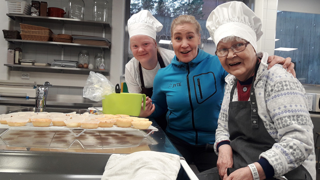 Opetuskeittiöllä on puuhakas tunnelma, kun astun sisälle. Sähkövatkaimet surisevat, kun Spesian opiskelijat ja naapurin sairaalaosaston kuntoutujat leipovat yhdessä. On taas yhteinen perjantai.