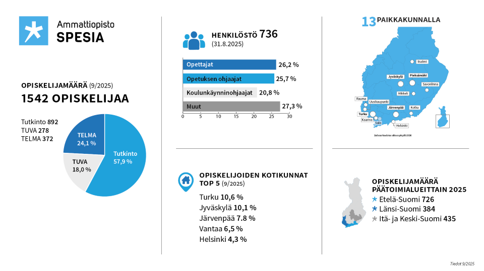 Spesia kouluttaa motivoituneita ja osaavia tekijöitä työelämään. Meillä opiskellaan käytännönläheisesti ja pienissä ryhmissä, opiskelijan tarpeet ja vahvuudet huomioiden.