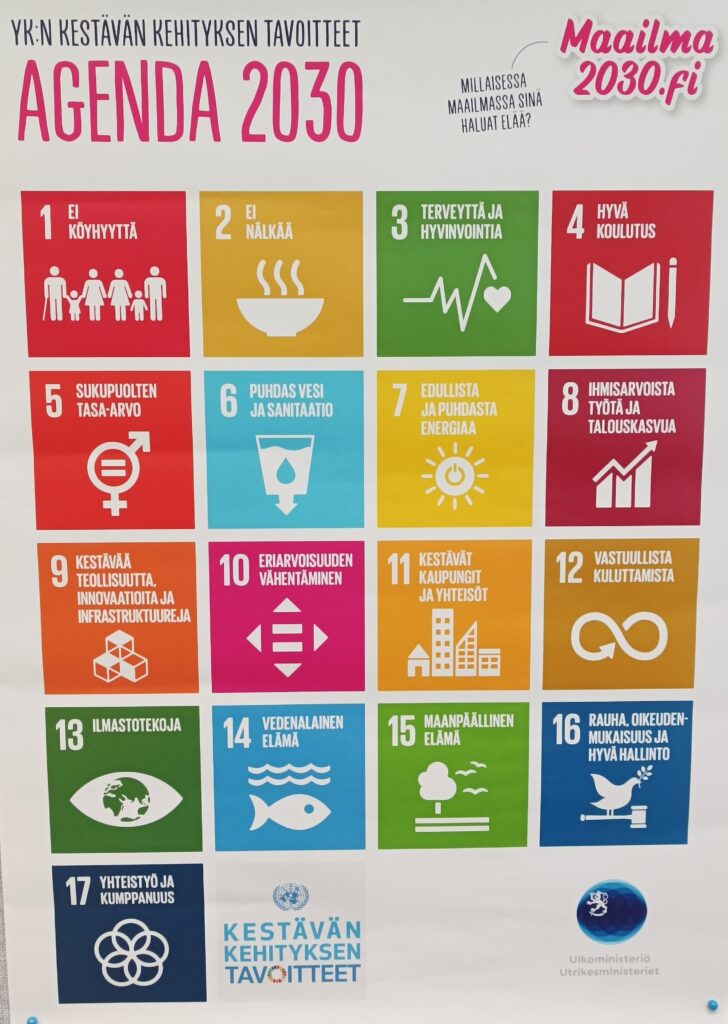 Kuvateksti: YK:n Agenda2030-toimintaohjelman kestävän kehityksen 17 tavoitetta, joita Spesian opiskelijat tutkivat.